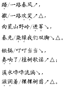 朗读符号说明 /表示时间停顿较短(朗读时,停顿时长一般为一拍);∥表示时间停顿较长(朗读时,停顿时长一般为二拍);△表示末尾一字是韵脚(朗读时,韵脚字要读得语气饱满,吐字归音圆润充足,要特殊润色);·表示重音(朗读时,或重读,加大音量,加重语气,或轻读,减小音量,含蓄处理);⌒表示语气延长(朗读时,字音读得长一些,声音要擎住,但绝不是拖沓,要恰到好处);~~ 表示颤音(朗读时,声音颤动,喉部抖动);表示连接线(朗读时,要连续,不停顿);↗表示语调上扬(朗读时,声音高亢激昂);↘表示语调低缓(朗读时,声音柔缓深沉)。