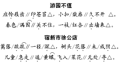 解析 《游园不值》诗人以探出墙外的红杏来渲染满园的春色。《宿新市徐公店》描绘了幽静、安逸的田园春光和儿童在菜花地边追逐蝴蝶的生动画面。这两首古诗的朗读基调均是浓烈的赞美和喜爱,是舒展飘逸的。朗读时,语速稍慢些,要读出古诗的韵律美,把握好停顿和语调的升降,读出抑扬顿挫感。