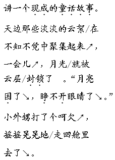 解析 本文主要写舅甥俩在望月中的愉快交谈,表现了小外甥“聪明好学,爱幻想”的特点和人们喜爱月亮,追求美好事物的思想感情。本文的朗读基调是富有童趣的,是恬适舒展的,充满了对月亮的喜爱之情。文中第一部分(1、2自然段),朗读时语气舒展恬适。第二部分(3~20自然段),朗读时抓住关键词语,如“叫醒”“出神”,读出对月亮的敏感、挚爱,语气活泼、亲切,富有童趣;接着舅甥背诗这一部分,语气欢快,节奏逐渐加快,不用追求古诗句的朗读感觉,流利、轻快地读出这些诗句即可;挑战共赢后,小外甥的一个问题,语气要好奇、惊讶;当“月光”“被云层封锁”后,小外甥的“月亮困了”,语气要天真迷醉。第三部分(21自然段),语气要轻柔恬适。