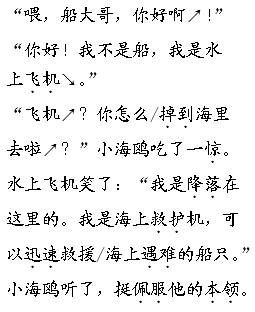 解析 本文是一篇科普童话,作者用拟人化的手法,形象地介绍了水上飞机的广泛用途,向我们展现了科技新成果。朗读基调是深情舒缓的。第一自然段,抓住“奇怪”一词,读出奇怪和疑问的语气。第二至七自然段,读出小海鸥“吃了一惊”的语气,读出水上飞机骄傲、自豪的语气,体现出水上飞机的神奇。读第八自然段时,语调一转,语气急切,表现出有紧急情况,节奏加快,当水上飞机飞上天空去救援时,语气充满敬佩,语调坚定舒展。