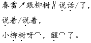 解析 本文是一首小诗,这首小诗每一小节的结构都相同,尤其是前四小节,内容也大体相同,因此在背诵时,大家可以用“……柳树……,……着……着,小柳……了”的句式练习背诵,这样既能体现相同与不同之处,还能提高背诵的速度。