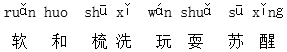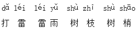 解析 这些词语大多是由本课生字组成的,先借助拼音多读几遍,尤其要读准翘舌音“树、枝、梢、软、梳、耍”和平舌音“苏”。再把它们记牢,以便今后很好地运用。