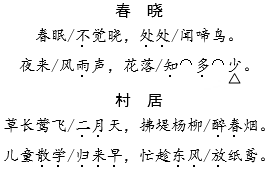 解析 《春晓》诗意含蓄,情真意切。朗读时,速度要稍慢,一边读一边想象。第一、三句声音较实,第二、四句声音较虚。“眠、处、来、落”这四个字适当拉长,稍作停顿;“晓、鸟、少”这三个韵脚要读实。《村居》较为明快,朗读时,要轻快、流畅,体现环境的优美和儿童生活的快乐。“飞、柳、学、风”这四个字稍作停顿,要读好韵脚“天、烟、鸢”。