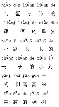 解析 这些词语都是由两部分组成的,一部分是描写的事物,另一部分是事物的特点。前边的词语是先说描写的事物,即鸟蛋、小路、杨树;再说事物有什么样的特点,即凉凉的、长长的、高高的。后边的词语正好和前边的词语相反,先说事物有什么样的特点,再说所描写的是什么事物。虽然它们的前后顺序不同,但所表达的意思是一样的。像这样的词语还有很多,如:棉花白白的,白白的棉花;荷叶绿绿的,绿绿的荷叶;个子高高的,高高的个子……