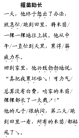 解析 《揠苗助长》这则寓言告诉我们:不顾事物发展的客观规律,急于求成,反而会把事情弄糟。朗读时,第一自然段抓住“巴望”这个词,用急切的语气;第二、三自然段突出“筋疲力尽”“兴致勃勃”这两个词,读出农夫自以为得计的可笑的语气;第四自然段抓住“纳闷”一词,读出疑惑的语气。《鹬蚌相争》这则寓言告诉我们:双方争利、互不相让,结果可能是两败俱伤,反而让别人从中获利。朗读时,鹬和蚌的对话要用骄横、互不相让的语气,语调激昂。最后一个自然段语气舒展。
