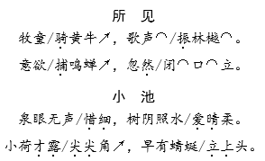 解析 《所见》这首诗描写了牧童放牛时捕蝉的生活情景,充满了生活情趣。朗读时,前两句用欢快的语调,声音轻快、响亮,体现出牧童放声歌唱,歌声飞出茂密的树林的感觉;后两句要轻声读,体现出牧童那种天真烂漫,怕把蝉吓跑的感觉。《小池》一诗向我们展现了一幅美好的“夏日荷塘图”,应该反复朗读,在朗读中欣赏诗的韵律,感受诗的情趣。朗读时,前两句用舒缓的语调,感受“泉眼无声惜细流,树阴照水爱晴柔”的柔和美;后两句用轻快的语调,感受初夏“小荷才露尖尖角,早有蜻蜓立上头”的勃(bó)勃生机。