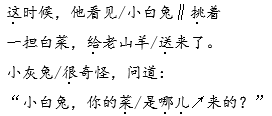 解析 这是一篇非常有教育意义的童话故事。小白兔和小灰兔都很有礼貌,在说话时用了“谢谢、您、请”等词语,朗读时,要表现出他们乐于助人、有礼貌的品质;在读小白兔种的白菜长大了的一段时,要用快乐的语气、语调;在读小灰兔看见小白兔挑着一担白菜送给老山羊而感到奇怪时,要表现出小灰兔惊奇的样子;而在读最后一个自然段时,要读出小白兔的自豪。