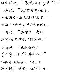 解析 这个故事与同学们的生活非常贴近,所以朗读这篇课文时,可采用“进入情境”朗读法,想象自己是课文中的一个人物。这个故事是玛莎丢背包引起的,玛莎的心情最为复杂,最好把自己当成玛莎,体会玛莎丢背包后的着急、难过、自责和无助,然后把你的感受融入课文进行朗读。这样朗读,会把文中的人物特点形象地表现出来。