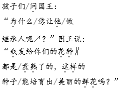 解析 朗读课文时可采用“进入角色”朗读法。本课的主要角色是雄日和国王。在朗读描写雄日的这部分内容时,要读出雄日用心种花,可种子却不发芽的急切心情。在朗读国王的问话和答话时,要根据国王这一身份进行朗读,读出他由不高兴到高兴的语气。