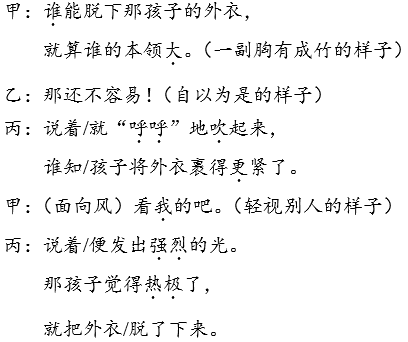 解析 课文人物形象鲜明,语言活泼,颇有个性,非常适合分角色朗读。朗读时,要结合课文内容和故事的发展变化,体会人物的心情变化,从而读好人物的语气。例如,第一自然段中太阳认为自己的本领比风大,所以太阳说的话要读出自大的感觉;第二自然段中风认为自己一定能赢,所以风说的话要读出自信、必胜的感觉;第四自然段中太阳说的话要读出胜利后得意忘形、不把风放在眼里的感觉;第八自然段中太阳说的话要读出心悦诚服的赞美之意。