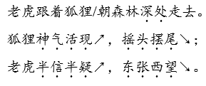 “老虎跟着狐狸朝森林深处走去。狐狸神气活现,摇头摆尾;老虎半信半疑,东张西望。”看谁能把加点词语的意思表演出来。