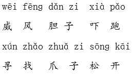 解析 读的时候,注意“找、爪”是翘舌音;“松”是平舌音;“寻”不要读成xín;“胆子”和“爪子”中“子”读轻声。写的时候注意字的结构,不要添减笔画。如“威、找”不要少写撇和点;“爪”不要添笔画写成“瓜”。