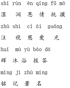 解析 读的时候,注意读准字音。如,“润”不要读成yùn、rèn;“恩”不要读成nēn;“辉”不要读成hūn;“抚”不要读成fú;“报答”的“答”是多音字,在这里读dá,不要读成dā;“摸”不要读成mē;“铭”不要读成nínɡ;“浴”不要读成yǔ;“注、视、湿、著”是翘舌音,“慈”是平舌音。