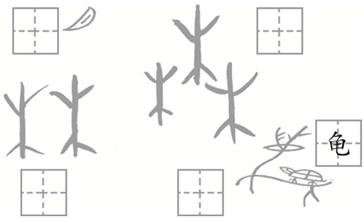 解析 仔细看文字画,体会发现画的是月亮、树木、鹿、龟。看到这些画,你会想到哪些字?在图画旁的田字格里写出这些字吧!