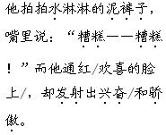 解析 朗读本文,同学们要带着兄妹俩踩水时的兴奋与欢乐,入情入境地读。如,读“使劲地踩着水”“溅起多高”“水淋淋的泥裤子”等语句时,要读出小哥哥踩水时的酣畅痛快;读“咬着唇儿”“提着裙儿”“轻轻地小心地跑”时,要读出小妹妹既想玩水又略有害怕的有趣的感觉。