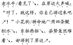 答案 小花狗在老水牛的鼓励下,通过自己的实践,用四条腿刨水,东扭西扭,拼命地游,从而学会了游泳。