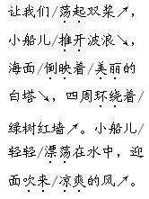 解析 首先,要明确课文每一小节写了什么,按照“景色美丽”“心情愉悦”“感谢祖国”的顺序记忆歌词内容。其次,要留意课文反复的修辞方法的运用,知道每一小节最后一句话都是“小船儿轻轻漂荡在水中,迎面吹来凉爽的风”。