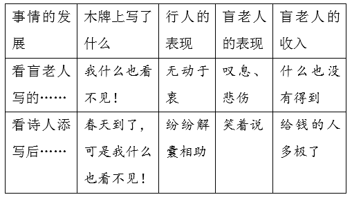 解析 这段是对“语言的魅力”的进一步讲解。先把诗人添上的几个字与盲老人的木牌上原先的句子连在一起,道出了这句话富有诗意;接着用排比与反问的修辞方法,描绘了春天美好的景象;然后通过对比,道出了盲老人的悲惨处境;最后又用反问句结尾。背诵前,要理清本段的行文脉络,读懂内容。在理解的基础上进行背诵就很容易了。