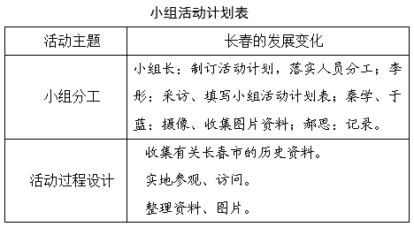 小组长:在确定了研究主题后,我们制订了详细的计划,分工合作,认真填写了小组活动计划表,通过上网查资料、阅读相关书籍、实地调查、采访有关人士等方式收集了大量的资料,并且在组内进行交流,对收集的资料进行分析处理和筛选。这是我们填写的“小组活动计划表”。