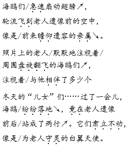 解析 本文讲述了一个十分感人的故事,语言朴实,饱含深情。在朗读过程中,要充分体会老人与海鸥的深厚感情。读老人与海鸥相伴的部分时,语气亲切,语调平稳;读海鸥为老人吊唁的部分时,语气悲壮,语调激昂,读出海鸥对老人的感激与哀悼(dào),甚至要读出令人震撼的情感。要注意突出重音,如,“翻飞盘旋”“连声鸣叫”“肃立不动”“炸了营”等要特殊强调,要读得深沉悲壮。