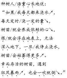 解析 朗读时,要认真体会、仔细揣摩“我”的心理活动和情感的变化。文中“我”的情感变化是:奇怪—越来越感到奇怪—更奇怪—非常感动,以此线索来确定朗读基调。总的来说,“我”看到种树人的做法感到奇怪时的所想,语气都是疑问的,语调是上扬的;“我”听了种树人的一番话时的所感,语气平和深情,语调平直舒展。文中种树人的语言,第一段话语气平和,舒展亲切;第二段话语气深情,语重心长。