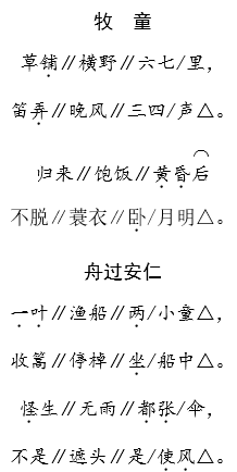 解析 本课所选的两首古诗,描写的都是古代儿童有趣的生活,表达了孩子无忧无虑、天真烂漫的天性。朗读时,要感受到清新的乡土气息,浓郁的生活情趣,语调活泼、亲切、自然。《牧童》向我们展示了一幅鲜活的牧童晚归休憩图,读时语调舒缓、轻快。《舟过安仁》展示了无忧无虑的两个小渔童充满童稚的行为和行为中透出的只有孩童才有的奇思妙想,读时要用充满童真和童趣的语气,有疑问,有恍然大悟之感,语调舒缓、张扬。