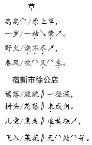 解析 朗读《草》时,第一句语气舒缓,表现野草的茂盛和草原的辽阔;第二句突出“枯”“荣”,表现野草一年一度的干枯和茂盛;第三句语调稍扬,显示野火的无情和野草的顽强,“烧不尽”重读;第四句语调平稳有力,表现野草旺盛的生命力,“又生”重读。朗读《宿新市徐公店》时,前两句语调可平稳柔和,快慢有致,渲(xuàn)染农村宁静、优美的环境气氛(fēn);第三句用欢快、跳跃的节奏表现儿童奔跑追逐黄蝴蝶时的喜悦心情;第四句中的“无处寻”要读得慢而稳,表现出失望的心情和深远的意境。