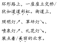 解析 要结合课文的具体内容进行背诵。例如背诵文章的第2自然段,首先要明确这段写了长安街、天安门城楼和广场四周这三个地方,而且每个地方一句话。背诵时可抓住“华灯高照”“川流不息”“灯光闪烁”“金碧辉煌”“光彩夺目”“勾画”“轮廓”等关键词来帮助记忆。