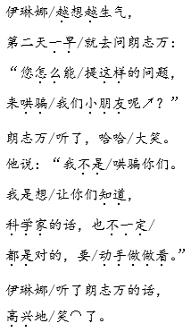 解析 这篇课文情节简单,却富有情趣,给人以启迪。同学们在朗读时,要以伊琳娜的情绪变化为切入点,弄清楚伊琳娜为什么生气,又为什么笑了。只有在把握她情感变化的基础上,才能读好有关伊琳娜的句子。另外,还要读好科学家朗志万的话。当他向小朋友们提问题时,要用一本正经的语气来读;当他听到伊琳娜的质问后,要用温和、肯定的语气来读。最后还要读好妈妈及两个小朋友的话。