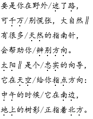 解析 本文是一篇介绍自然科学常识的小诗,告诉我们如果在野外迷了路辨别方向的四种方法。因此,同学们在朗读时,首先语速要稍慢,要像一位长者向别人介绍自己的经验一样。其次把句中强调的词语用重音读出来。最后要注意停顿。