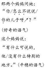 解析 本文内容浅显易懂,人物对话较多。同学们在分角色朗读时,一定要知道不同的人说话的语气不同,表达的意思就不同,表达的心情也不同。在读三个妈妈谈论自己的儿子的话时,前两个妈妈说话时很得意,读时语速要稍快,语调稍高。第三个妈妈说话很平淡,读时语调要平稳。老爷爷的话虽然很短,但风趣而又意味深长,因此一定要反复练习,读好老爷爷的话。