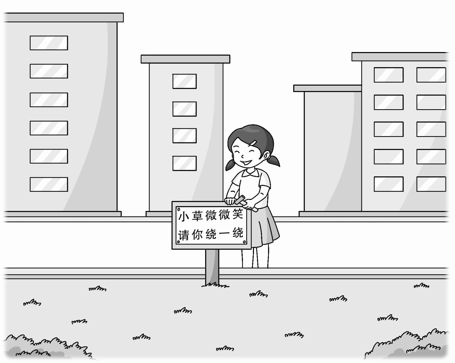 星期天,丽丽早早地来到了小区的草坪前,把写有“小草微微笑,请你绕一绕”的标语牌立在了草坪边上,嘴里还快乐地唱着:“没有花香,没有树高,我是一棵无人知道的小草……”