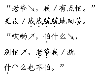 解析 本文的特点是故事情节比较曲折,很吸引人,又是采用对话的形式写的,朗读时必须把握人物说话时的不同情感,才能读得流利、有感情。如:县官蛮横愚蠢,读他说的话时,语调要上扬,表现出他的自高自大;差役聪明伶俐,读他说的话时,语气要轻,用害怕的语调。同学们要认真体会,在熟读的基础上分角色朗读。