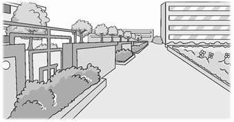 这幅画,远处是学校教学楼的一角,近处是围墙、花坛、甬道及草坪。虽然每一部分都不完整,但校园的几部分都有所体现。