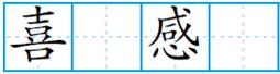 解析 我们在练习书写以上几个字时要注意:“喜”字笔画较多,上下布局要紧凑,横画间距均匀,第九画的横要拉长,突出主笔;“感”字的上部不宜写得过大,心字底要托上,上下重心保持一致;“谢”字左右布局要紧凑,中间的“