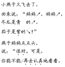 解析 本文对话较多,适合分角色朗读。朗读时,要用不同的语气,燕子妈妈说话时态度亲切,读它的话,语速要慢,要用激励、赞扬的语气。读小燕子的话时,语速可稍快,要关注到小燕子的心情变化,体现出它每一次有新发现后的那种兴奋的心情。另外,在读对话时,还要关注到对话前的提示语,想一想小燕子和燕子妈妈都是怎样说的,以此来帮助自己更好地体会它们的心情,这样才能读好课文。