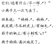 答案 因为小燕子观察得一次比一次仔细,最后从大小、颜色及细微处三个方面找出了冬瓜与茄子的区别,所以燕子妈妈笑了。