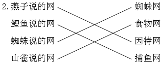 2.抓住燕子、鲤鱼、蜘蛛、山雀的语言,仔细分析可知,燕子说的是“因特网”,鲤鱼说的是“捕鱼网”,蜘蛛说的是“蜘蛛网”,山雀说的是“食物网”。