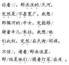 解析 读好这首诗,想象画面很重要。根据每小节的内容想象画面。第一小节应读出一份惊喜;第二小节应表现出一种赞美;第三小节表现出欢乐;第四小节要读出意境中的那一丝忧郁,那种淡淡的伤感。朗读时,要把声音放得柔和而舒缓,轻声慢读。