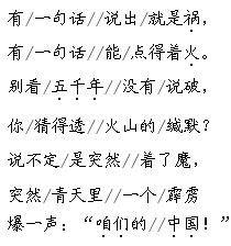 解析 “有一句话”要缓慢而字字有力地读出来,而后作一个较长的停顿,然后逐渐加快语速将语意推进。在朗读时要善于蓄势,为了将那一句霹雳般的话语淋漓尽致地表达出来,要采取欲扬先抑的办法。此外,读前后两节诗歌时,还要注意节奏上的变化。