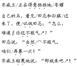 解析 朗读时,要联系课文中人物的身份、性格、心情,注意语速和语调的变化。如读田忌的“垂头丧气”,读齐威王的“得意扬扬”,读孙膑的“胸有成竹”时,要分别用泄气、轻蔑和信心十足的语气。