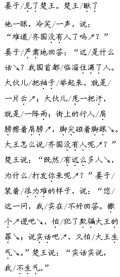 解析 文中的对话展示了人物的性格特点,朗读时,注意读出人物的不同语气。楚王是一国之君,他想侮辱来访的晏子,以达到显显楚国威风的目的。因此,他的话语调略高,语速宜缓,表现出他的傲慢无礼,还有在失败面前的窘迫。晏子是一位代表齐国出访楚国的使者,面对侮辱不急不躁、镇定从容。他的话语调多变,或嘲弄戏耍,或诙谐反问。因此,读时语调要富于变化。