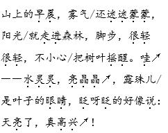 解析 这首儿童诗语言生动、有趣,描写形象,富有情趣,表达了作者对大自然的喜爱之情。朗读时,语调要轻松、活泼,最后一句“天亮了,真高兴”要用快乐的语调读得响亮有力。