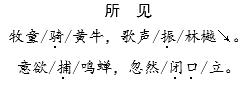 解析 《村居》前两句写景,主要有“草”“莺”“扬柳”等;后两句写人,写儿童放学后放风筝。按照这个思路背诵就很容易了。背诵《所见》时,可以结合书中的插图,在脑海中呈现出这样一幅画面:一个小孩在牛背上唱歌,唱着唱着,突然不唱了,悄悄地去捕蝉。这样一想象,古诗就好背多了。