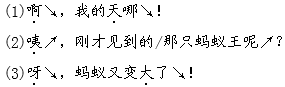 解析 第二自然段语言凝炼、传神,生动地写了詹森看到蚂蚁由正常大小再次变大的经过。朗读时,要根据不同的内容读出不同的语气。可以把自己当成文中的詹森,想一想,发现蚂蚁王不见了时,是怎样的心情,再次看到蚂蚁变大后又是什么心情,然后带着这样的心情来读这个自然段。朗读过程中,既要把课文读通顺,又要突出重音,尤其是“啊”“呀”等词语一定要重读。