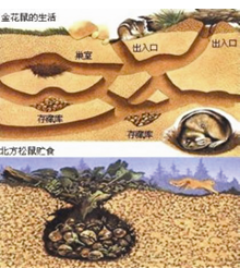 习惯 松鼠有贮(zhù)藏食物的习惯。每当果实成熟的时候,经常可以看到它嘴里含着胡桃、橡实或者其他好吃的东西,每当它从一个树枝跳到另一个树枝的时候,贮备就会增加。它不仅搜集胡桃和成熟的果实,而且还常常把蘑菇挂在上面的树枝上,待风干后,收藏到仓库里。它具有一种高超的本领,既能找到合适的树枝,并把蘑菇挂在上面,而且晒干后不会掉下来。在松鼠的仓库里,发现有胡桃和其他植物种子,但没有一个是腐烂的或生虫子的,质量全都很好。