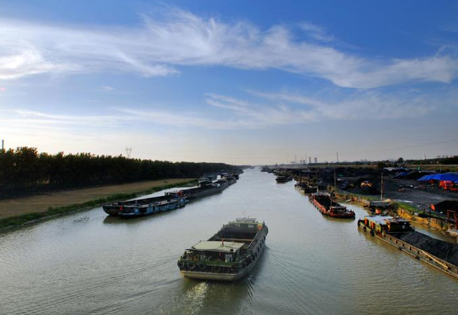 指京杭大运河,是世界上开凿(záo)最早、最长的人工运河。北起北京,南至杭州,是与万里长城齐名的伟大工程。春秋吴国为伐齐国而开凿,隋朝大幅度扩修并贯通至都城洛阳且连涿郡,元朝翻修时弃洛阳而取直至北京。开凿到现在已有2500多年的历史。2002年,大运河被纳入了“南水北调”三线工程之一。