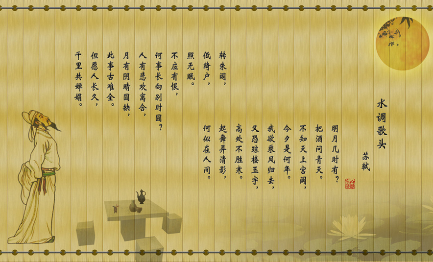 明月几时有,把酒问青天。不知天上宫阙,今夕是何年。我欲乘风归去,又恐琼楼玉宇,高处不胜寒。起舞弄清影,何似在人间。转朱阁,低绮户,照无眠。不应有恨,何事长向别时圆。人有悲欢离合,月有阴晴圆缺,此事古难全。但愿人长久,千里共婵娟。