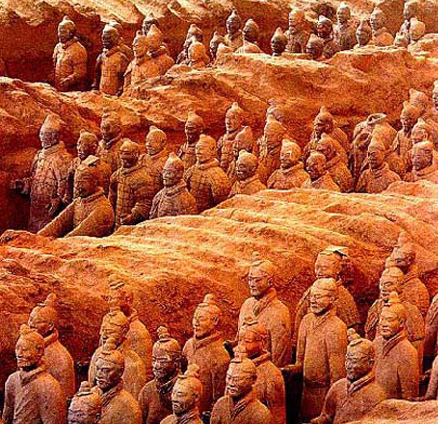 公元前246年,秦王嬴政开始在骊山(今陕西西安市临潼区东南)修建自己的陵墓。最多时曾役使刑徒70余万,历时38年才修建完毕。今经考古探测,整个陵垣(yuán)有内外两重,设有四门及角楼,外垣周长6250米,呈长方形。陵墓为方形覆斗式,位于内垣的南半部,高76米,周长2000米。1974年,在骊山陵东侧3里处,发现了三个兵马俑陪葬坑,俑堆规模宏大,内藏文物丰富,现已出土兵马俑近8000个,青铜兵器万余件和大量战车。其中兵马俑形态逼真,刻画精致,大小与真人真马相同,是研究秦代军事和雕塑艺术的珍贵资料。