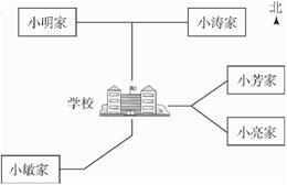 根据图中右上角的指北方向标,以学校为观察点,确定五名同学家的位置。小明先向北面走,再向西面走回到了家,由此判定小明的家在学校的西北方向,即在左上角;小涛先向北面走,再向东面走回到了家,由此判定小涛家在学校的东北方向,即右上角;小敏先向南面走,再向西南方向走,然后向西面走回到了家,由此判定小敏家在学校的西南方向,即左下角;小亮先向东面走,再向东南方向走回到了家,由此判定小亮家在学校的东南方向,即右下角,剩下的一个位置一定是小芳家。